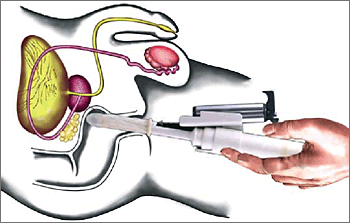 Transrektaler Ultraschall (TRUS). Der Untersucher führt die Sonde ihre Spitze liegt unter der Prostata im Rektum (Mastdarm).